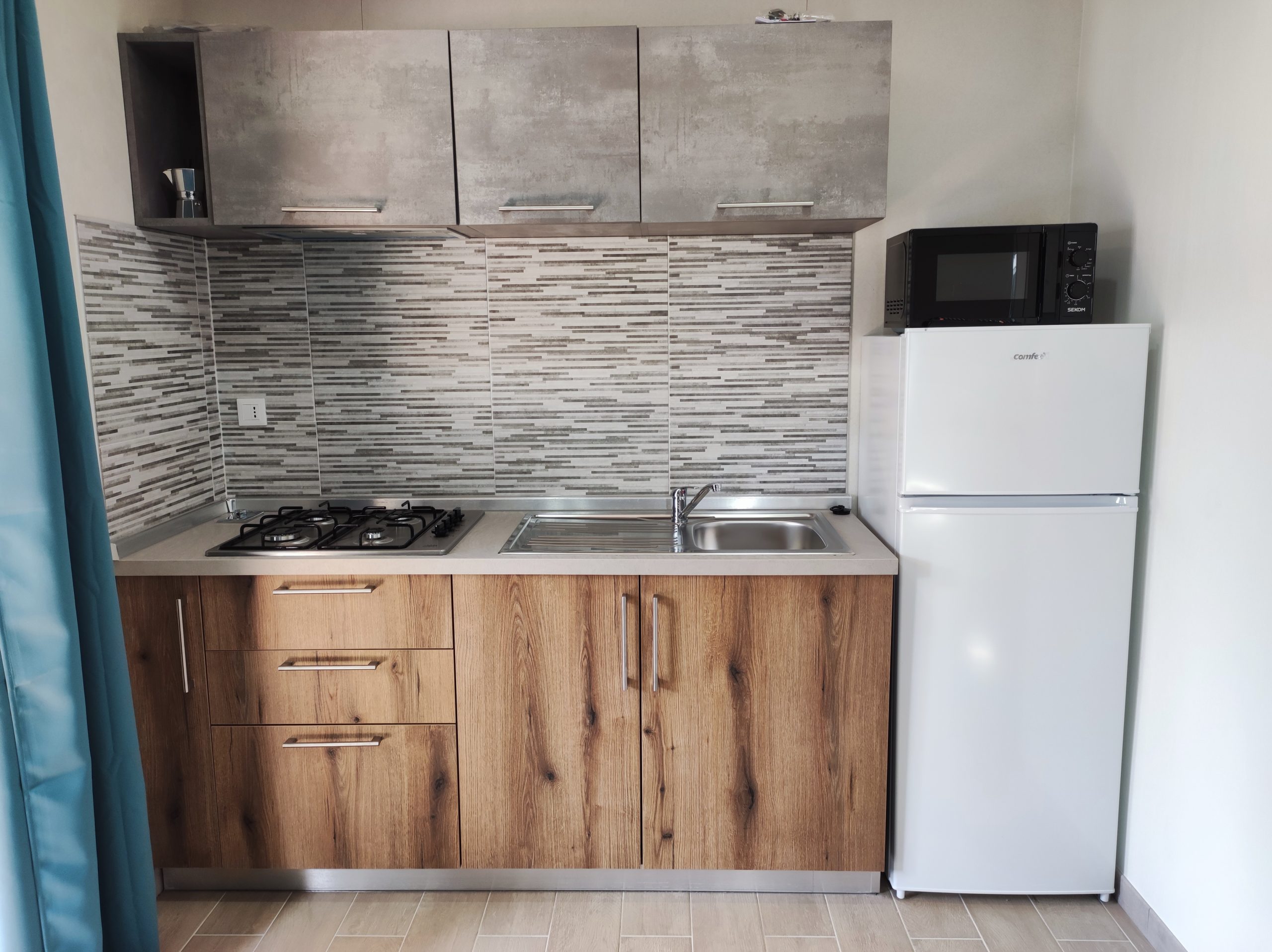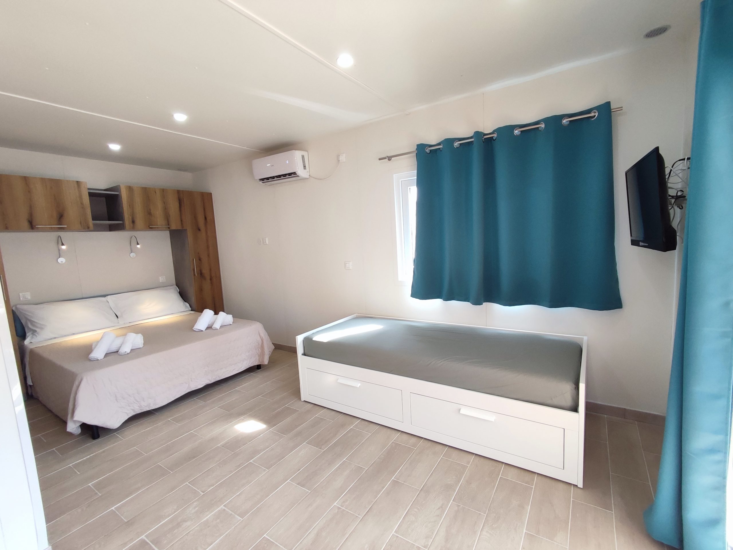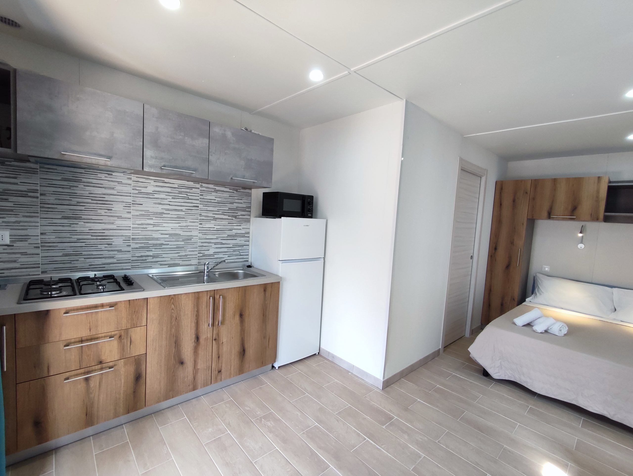 Einzimmerwohnung von etwa 20 m², die bis zu 4 Personen bequem beherbergen kann. Besteht aus einem Wohnbereich mit Kochnische und Doppel-Schlafsofa, Doppelbett, Badezimmer mit WC, Bidet, Waschbecken und Duschkabine, TV, Mikrowelle und Klimaanlage (gegen Gebühr). Außenveranda von etwa 9 m², überdacht und mit Gartenmöbeln ausgestattet.