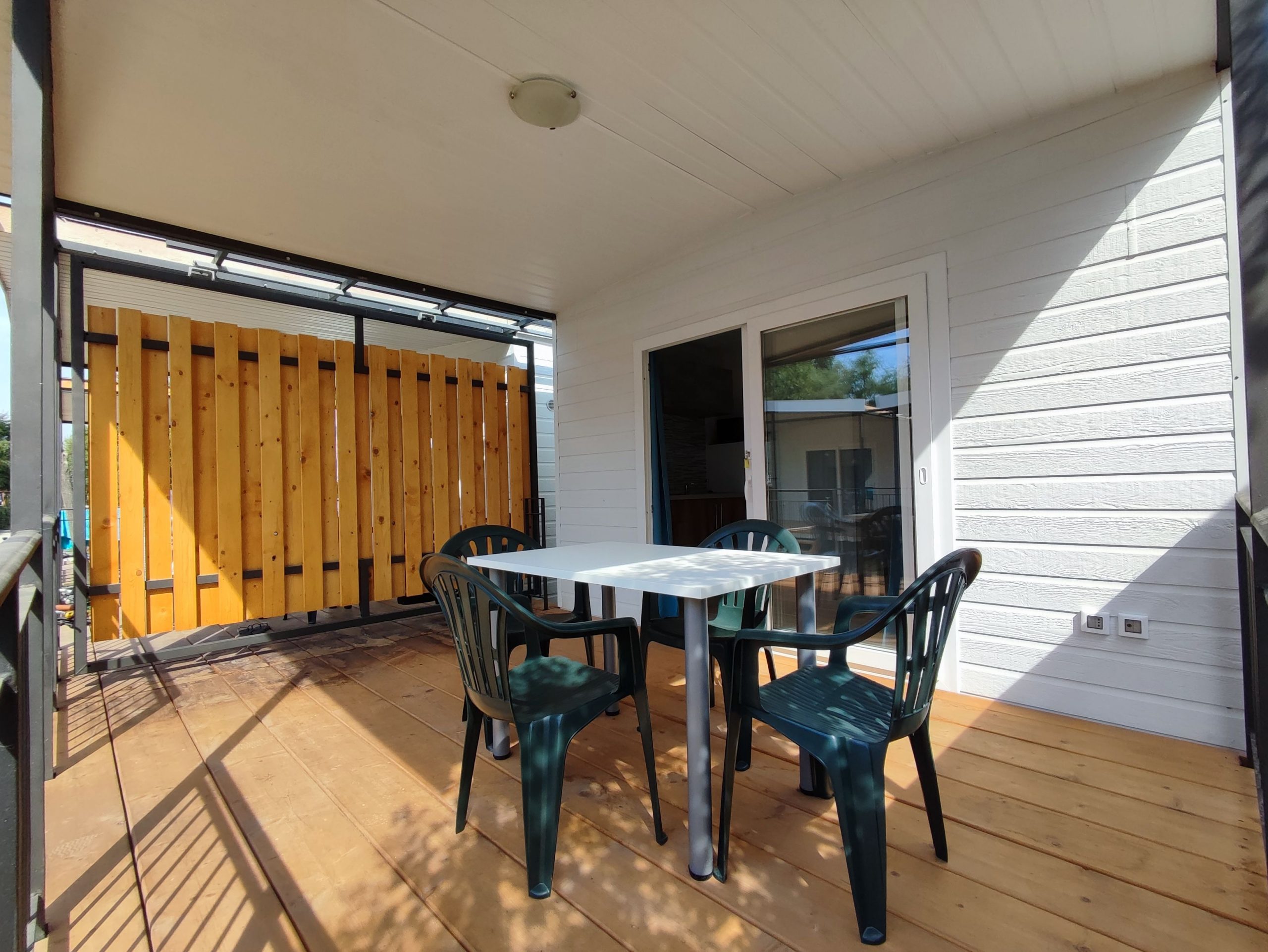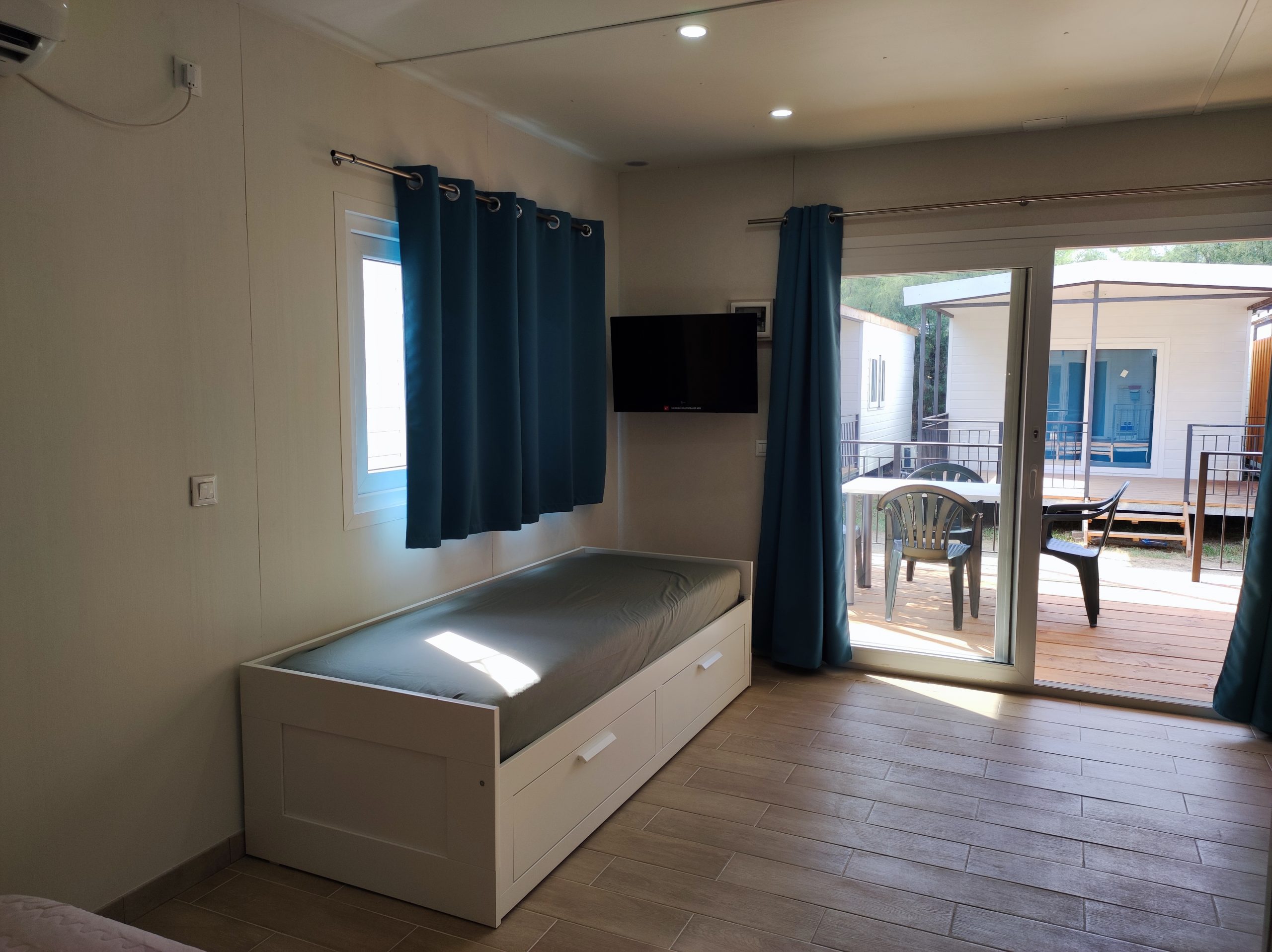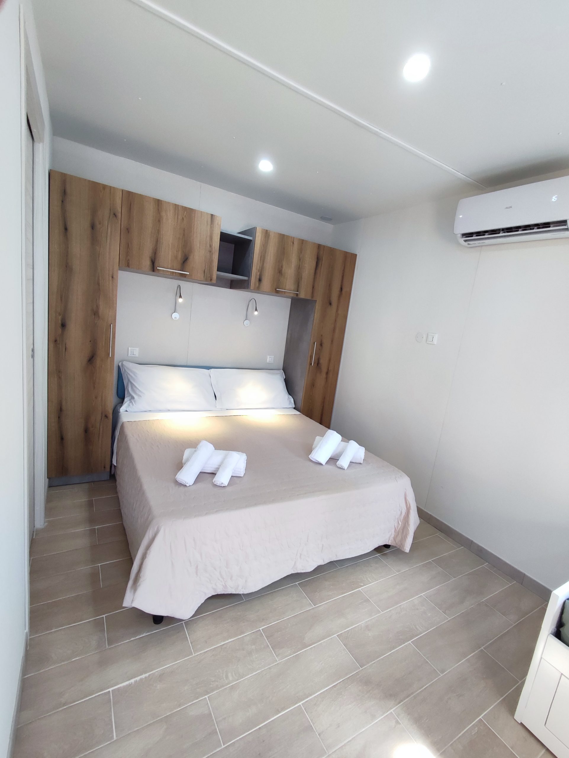 Einzimmerwohnung von etwa 20 m², die bis zu 4 Personen bequem beherbergen kann. Besteht aus einem Wohnbereich mit Kochnische und Doppel-Schlafsofa, Doppelbett, Badezimmer mit WC, Bidet, Waschbecken und Duschkabine, TV, Mikrowelle und Klimaanlage (gegen Gebühr). Außenveranda von etwa 9 m², überdacht und mit Gartenmöbeln ausgestattet.