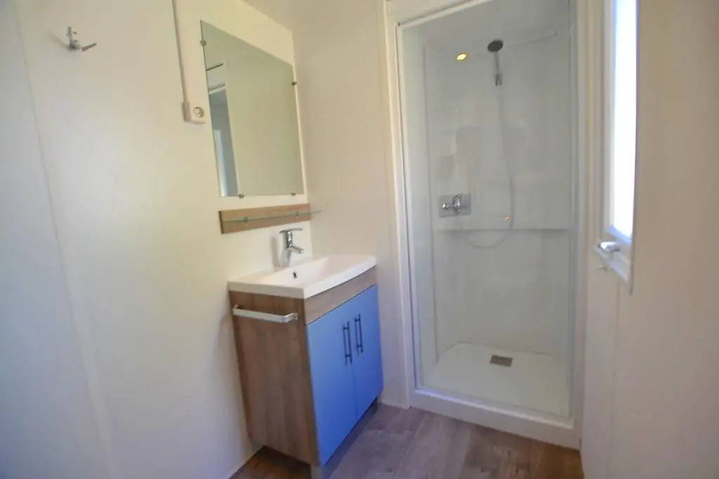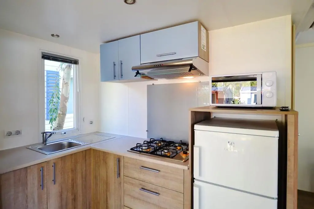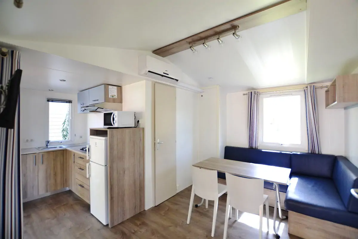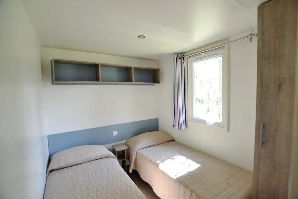 Dreizimmerwohnung von etwa 28 m², die bis zu 6 Personen bequem beherbergen kann. Besteht aus einem Wohnbereich mit Kochnische und Doppel-Schlafsofa, einem Zimmer mit französischem Doppelbett (140 cm), einem Zimmer mit zwei Einzelbetten, Badezimmer mit WC, Waschbecken und Duschkabine, TV, Mikrowelle und Klimaanlage (gegen Gebühr). Außenveranda von etwa 15 m², überdacht und mit Gartenmöbeln ausgestattet.