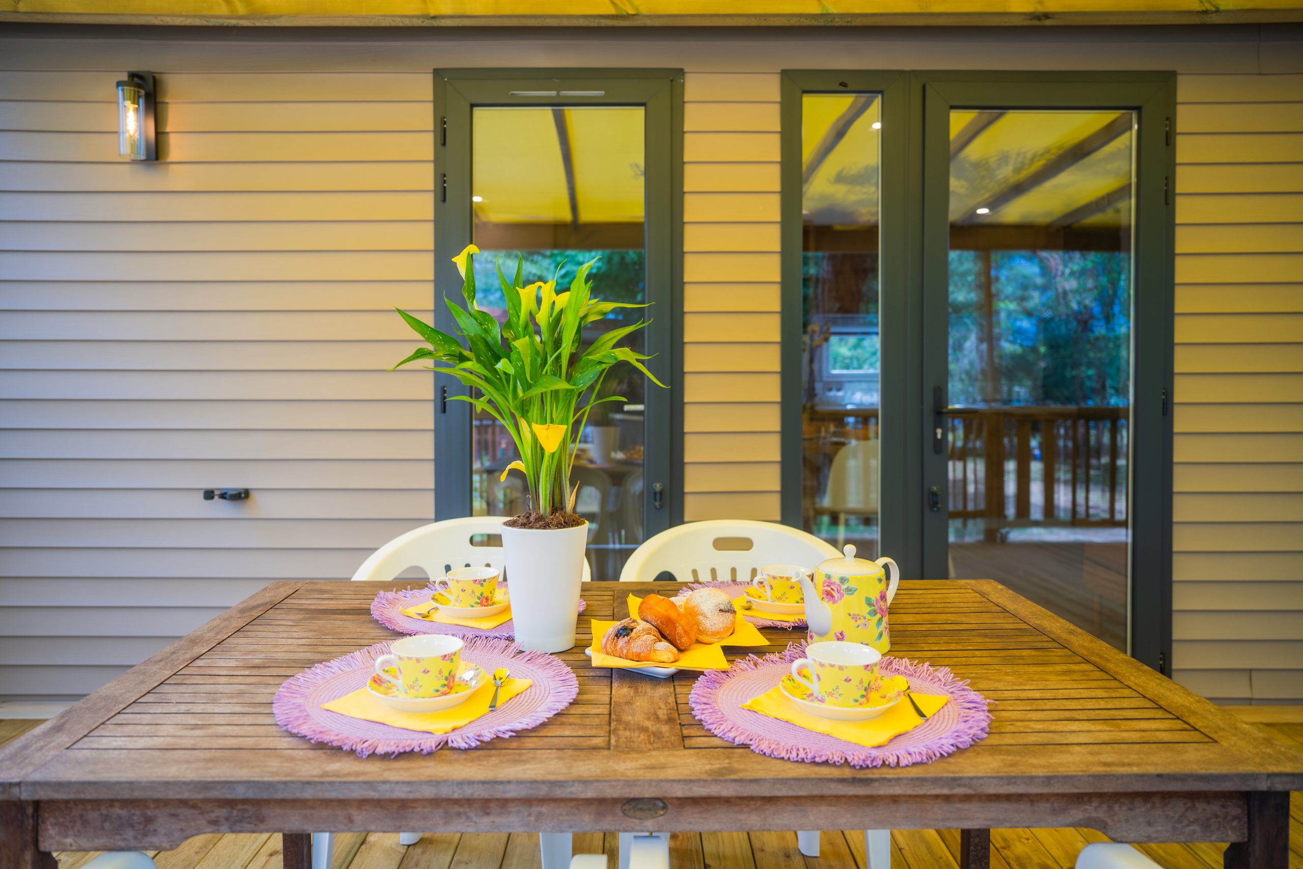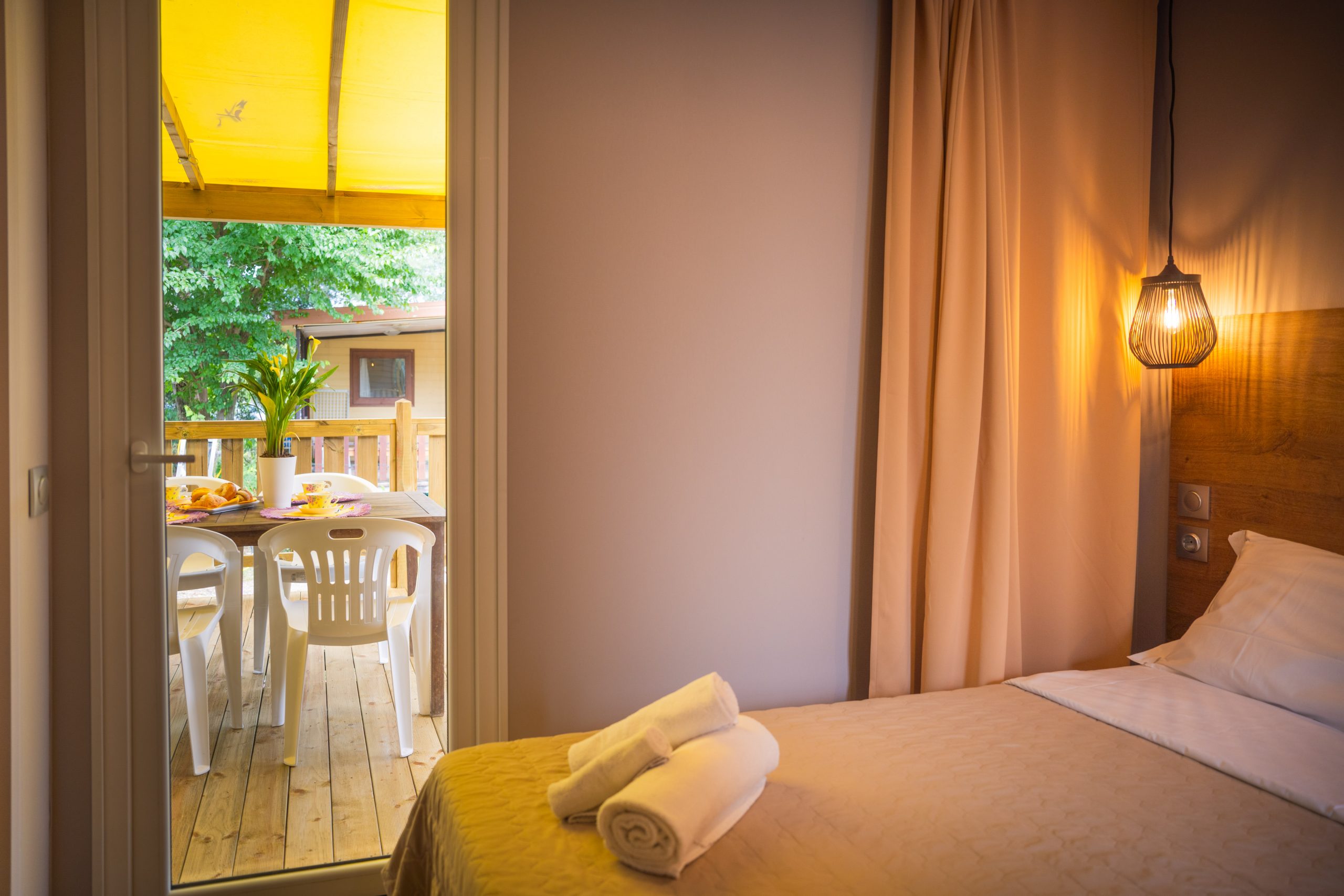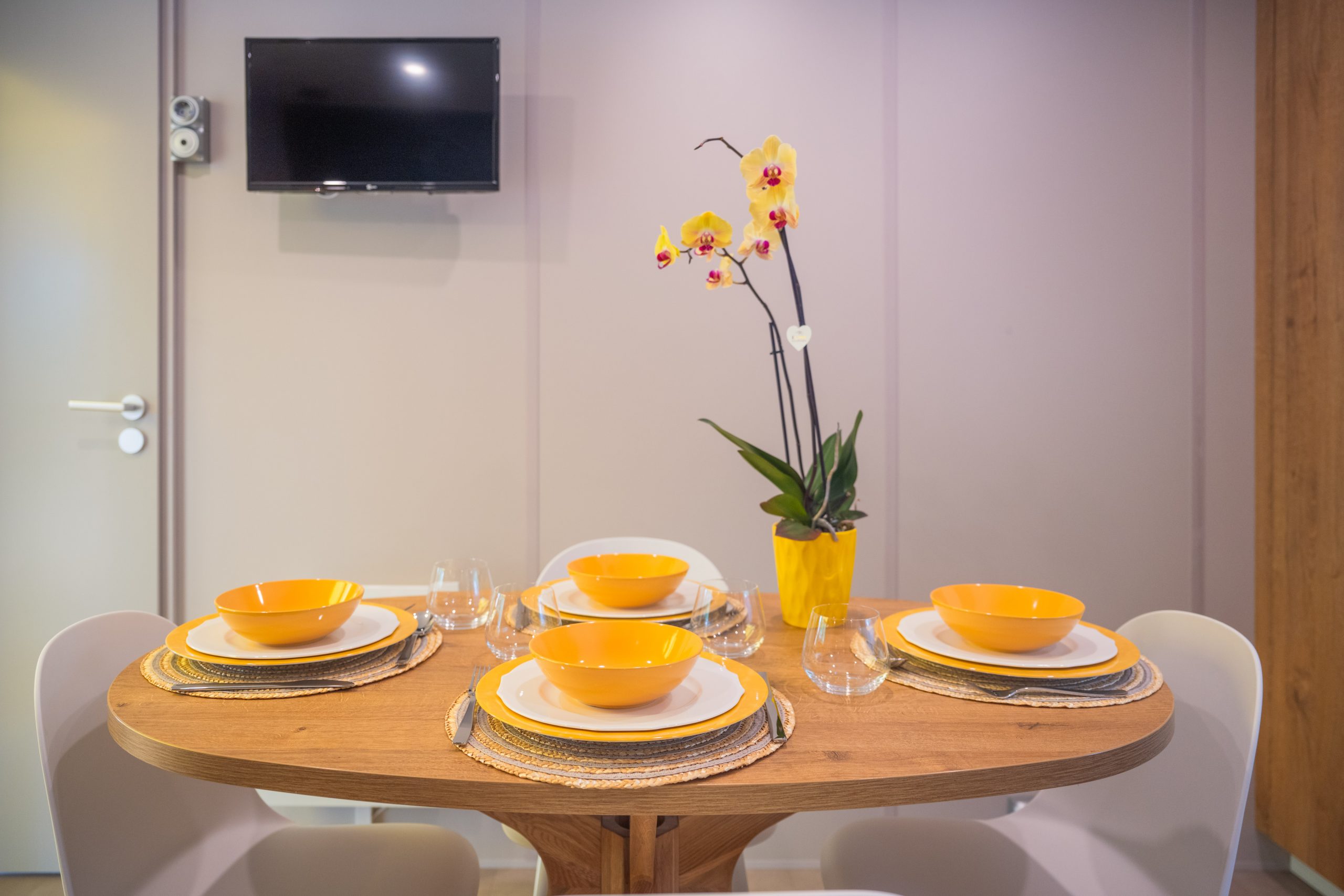 Zweizimmerwohnung von etwa 20 m², die bis zu 3 Personen bequem beherbergen kann. Besteht aus einem Wohnbereich mit Kochnische und einem Einzel-Schlafsofa, einem Zimmer mit französischem Doppelbett (140 cm), Badezimmer mit WC, Waschbecken und Duschkabine, TV, Mikrowelle und Klimaanlage (gegen Gebühr). Außenveranda von etwa 15 m², überdacht und mit Gartenmöbeln ausgestattet.