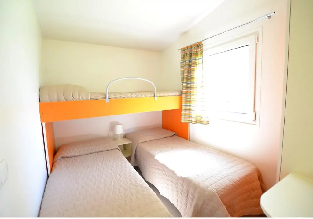 Dreizimmerwohnung von etwa 34 m², die bis zu 5 Personen bequem beherbergen kann. Besteht aus einem Wohnbereich mit Kochnische und Sofa, einem Schlafzimmer mit Doppelbett, einem Schlafzimmer mit drei Einzelbetten (eins davon erhöht), Badezimmer mit WC, Bidet, Waschbecken und Duschkabine, TV, Mikrowelle und Klimaanlage (gegen Gebühr). Außenveranda von etwa 9 m², überdacht und mit Gartenmöbeln ausgestattet.