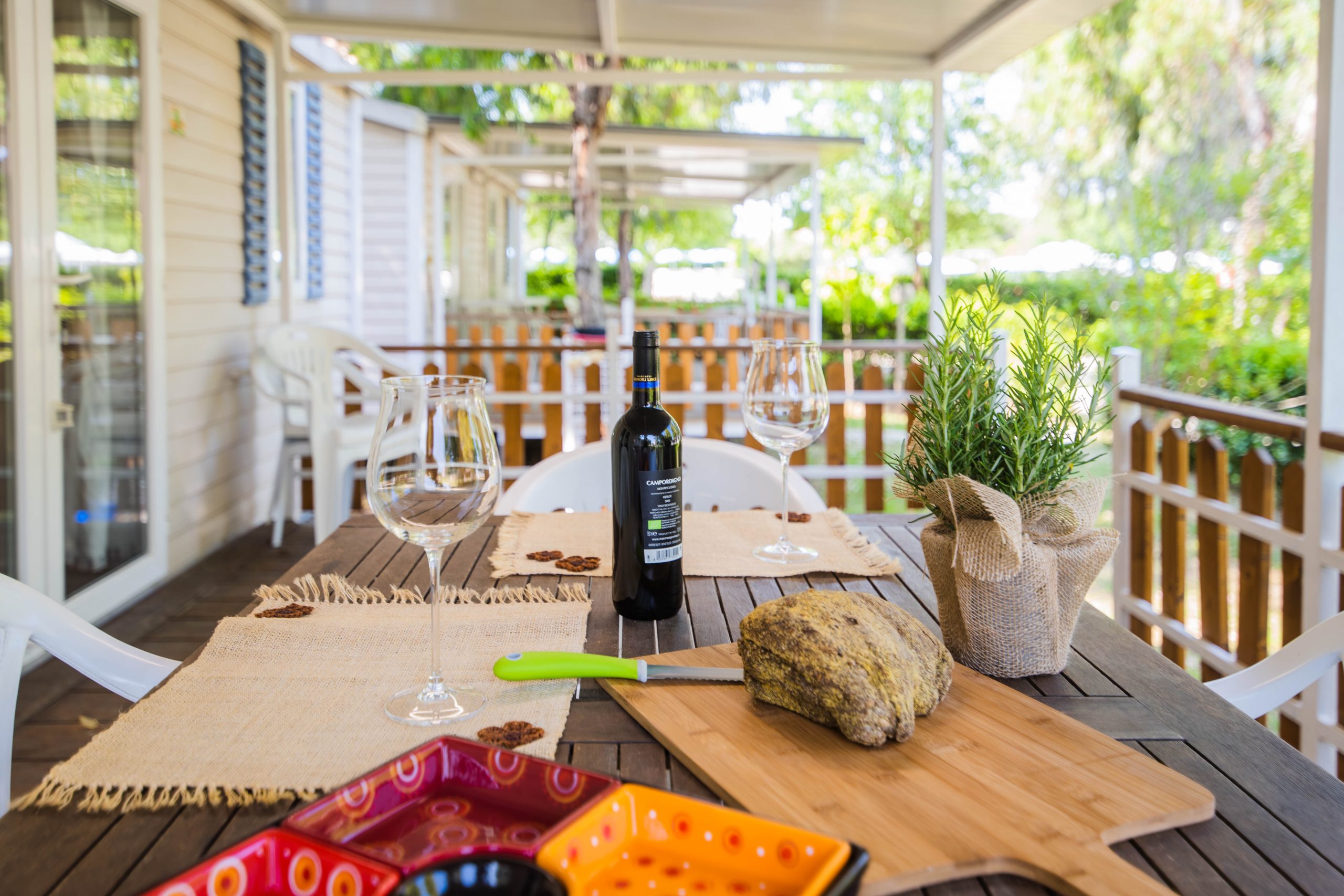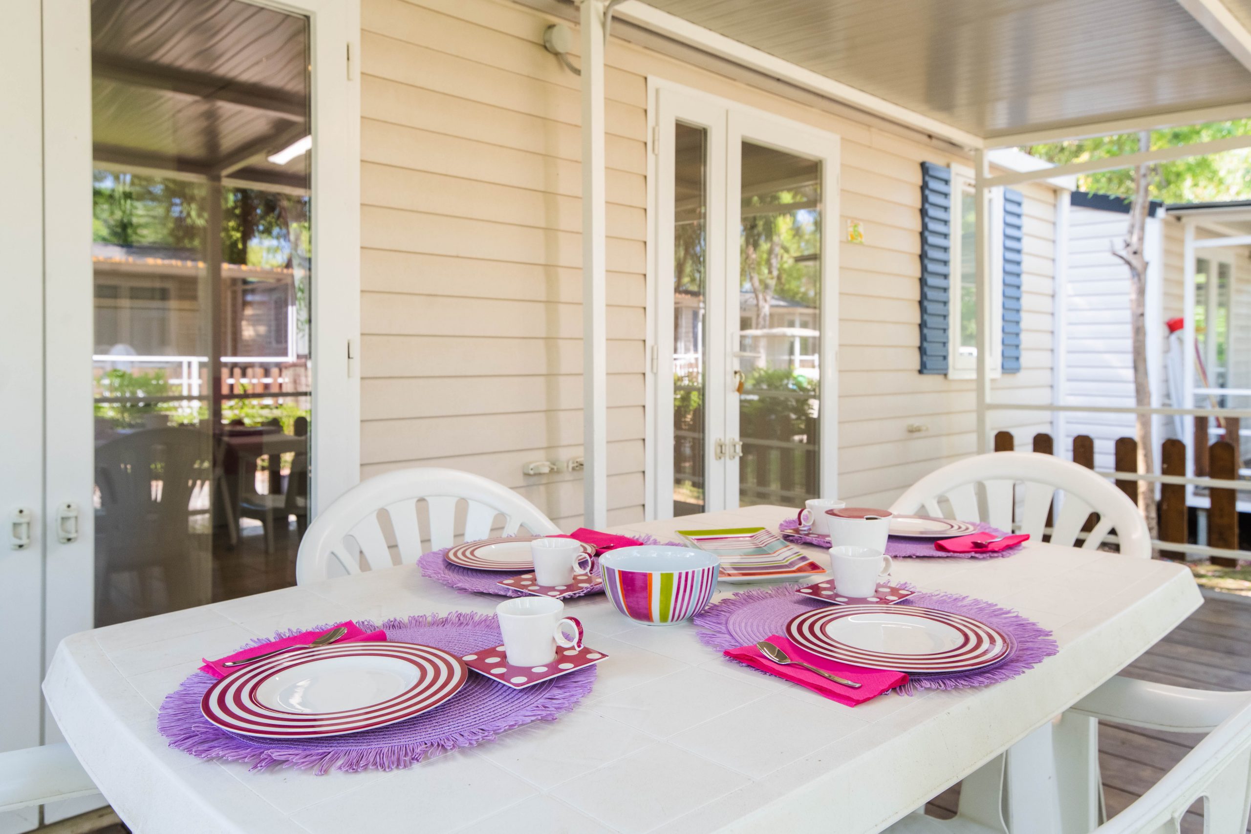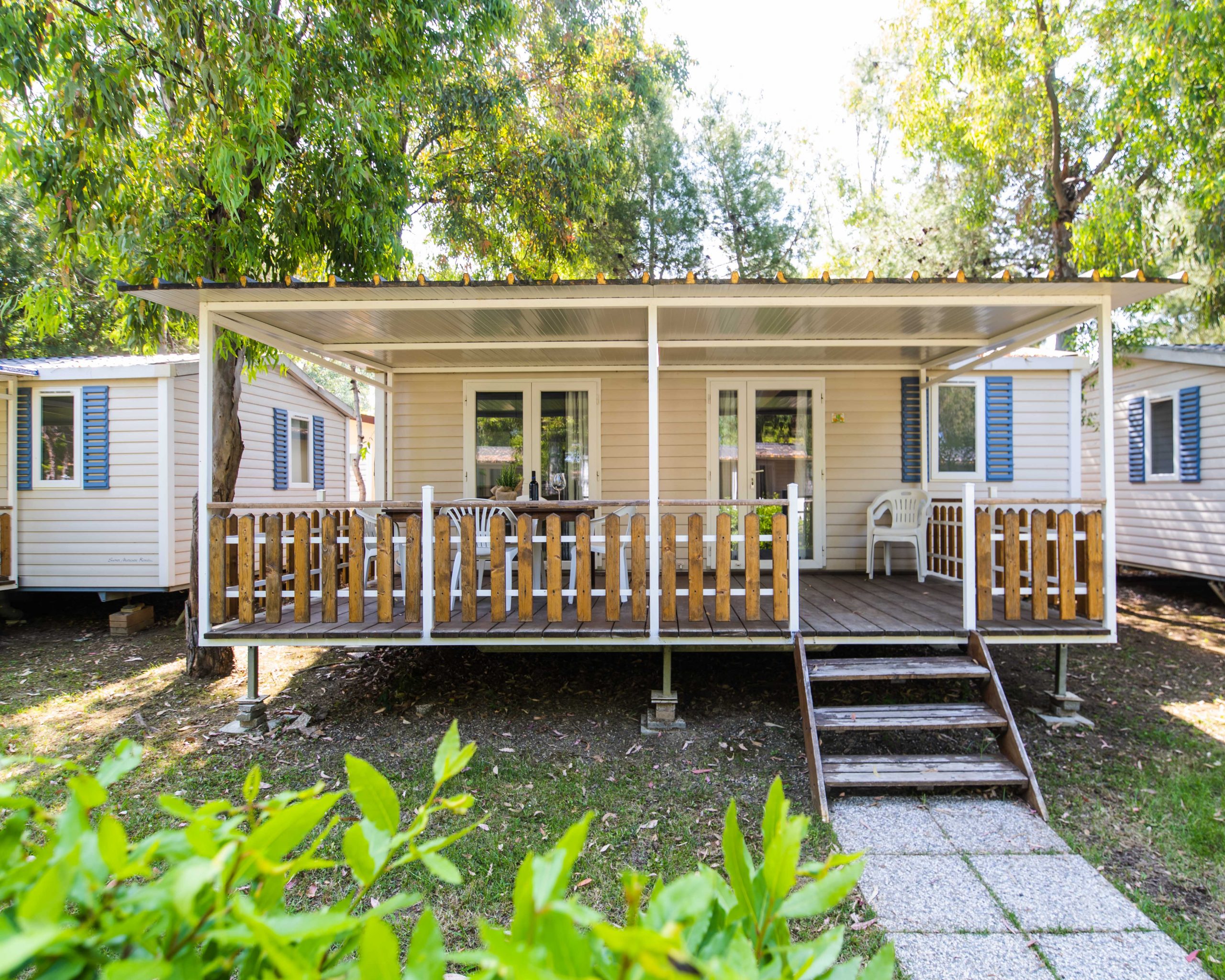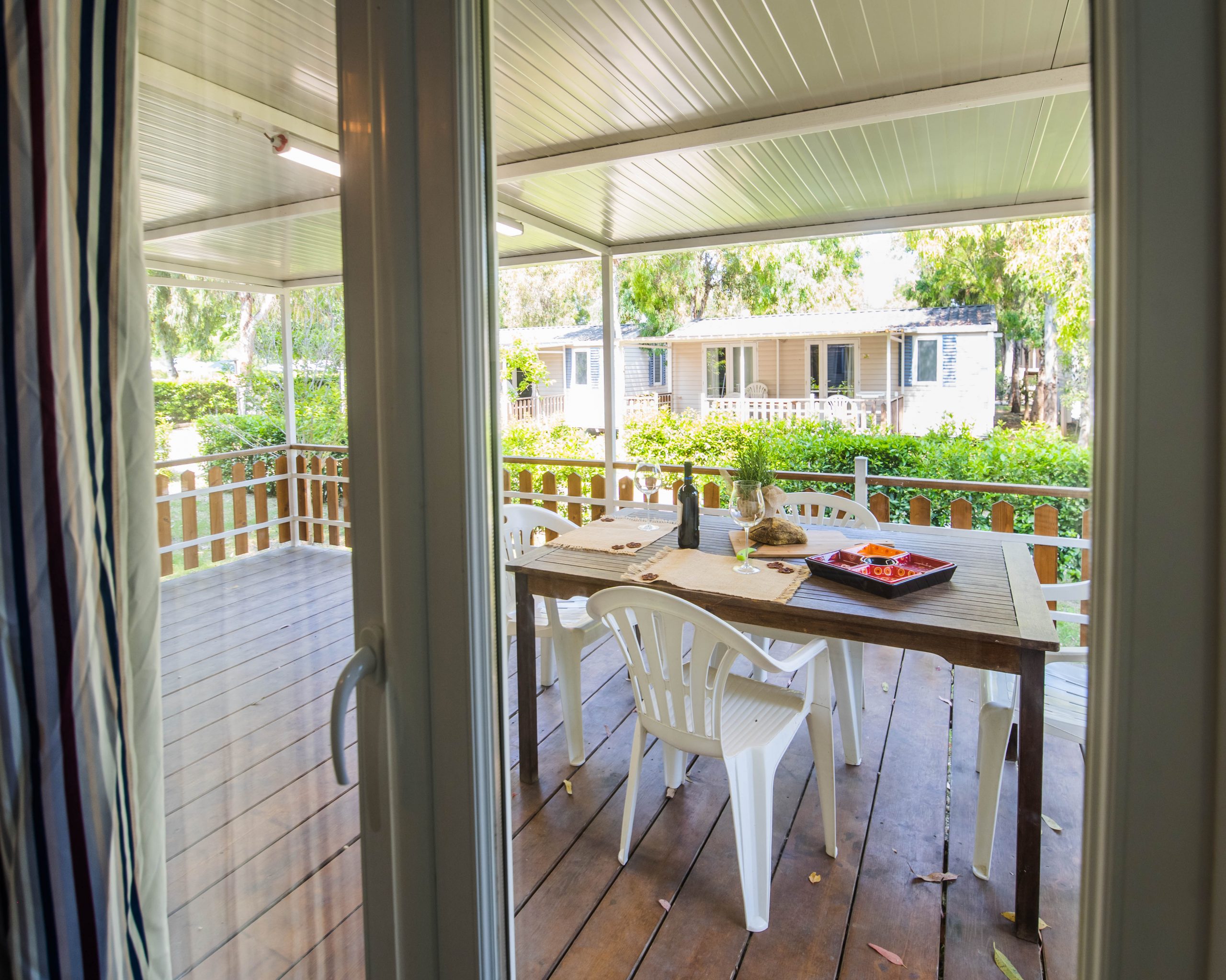 Trilocale di circa 28mq che può ospitare in piena comodità fino a 6 persone. Composto da zona giorno con angolo cottura e divano letto doppio, camera con letto matrimoniale alla francese da 140 cm, una camera con due letti singoli, bagno con servizi (wc e lavandino) e box doccia, tv, forno a microonde ed aria condizionata (a pagamento). Veranda esterna di circa 15mq, coperta ed attrezzata con mobili da giardino.