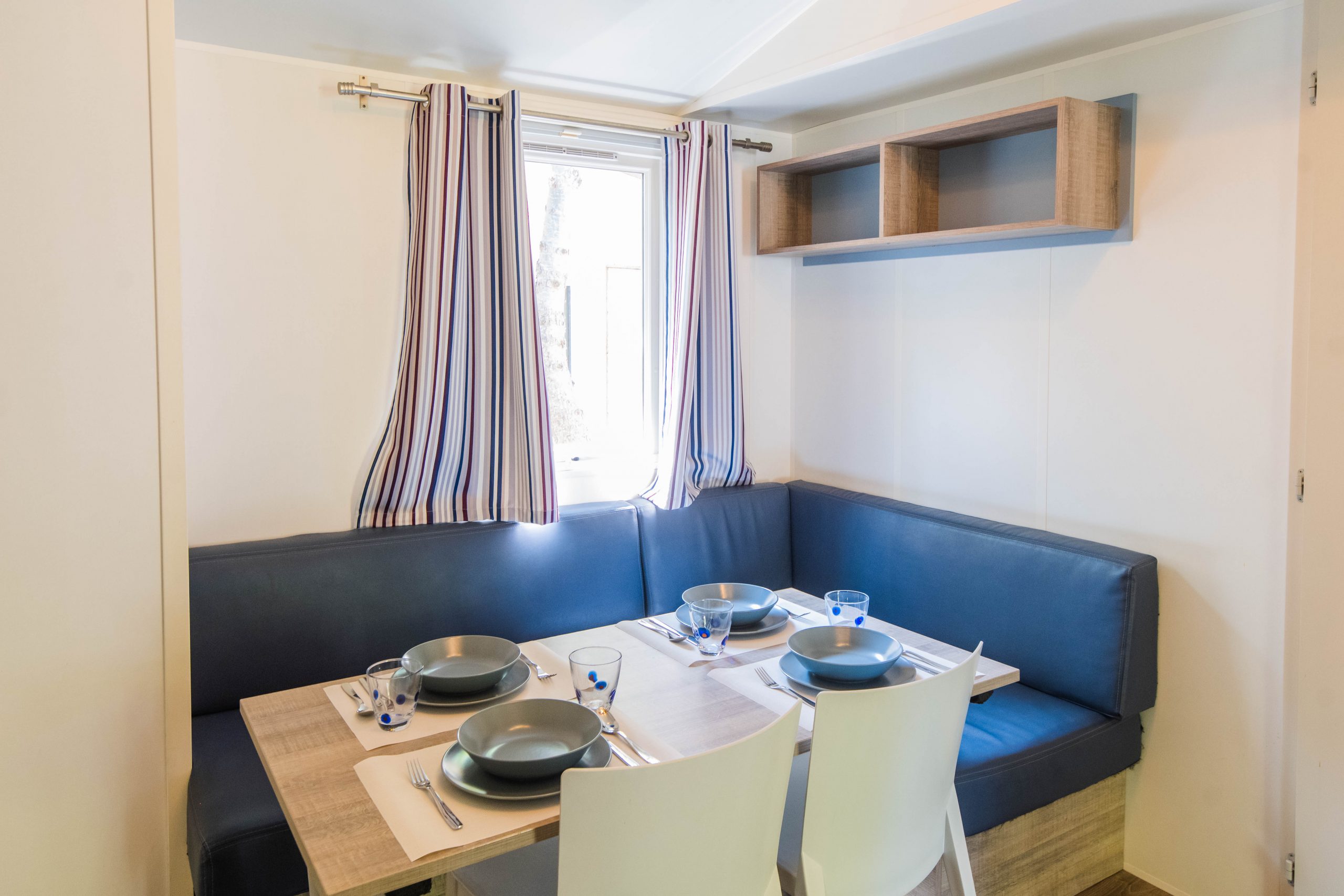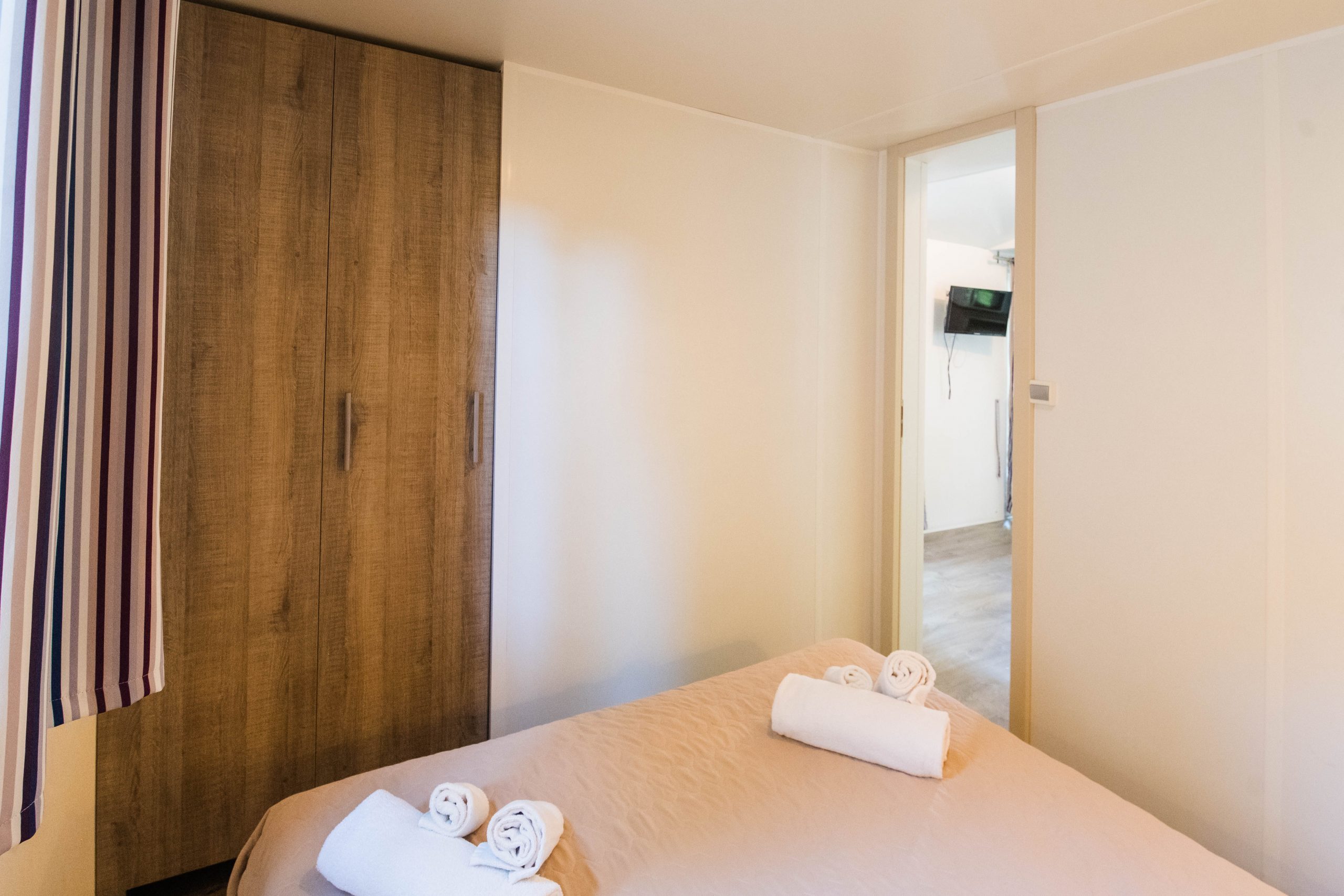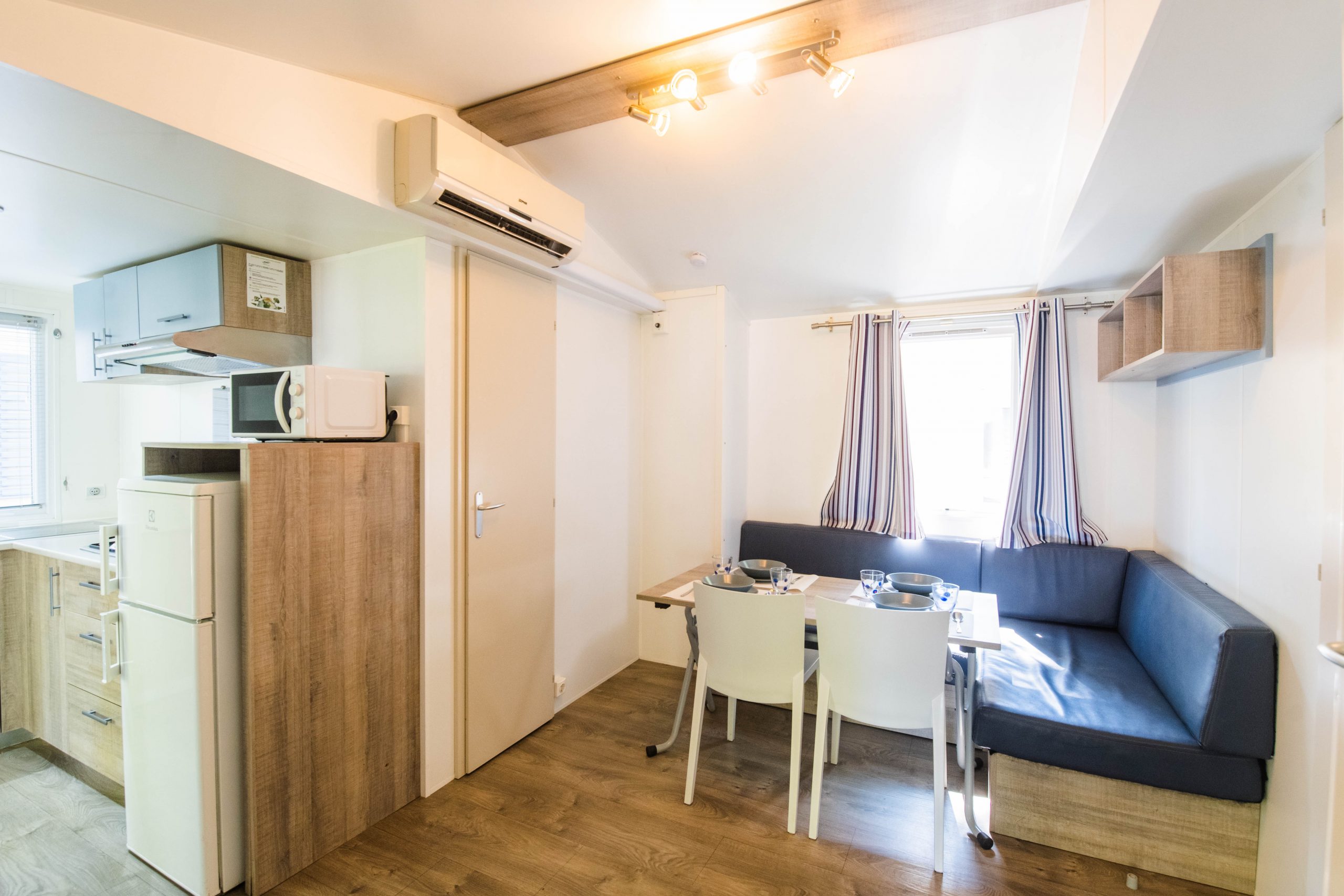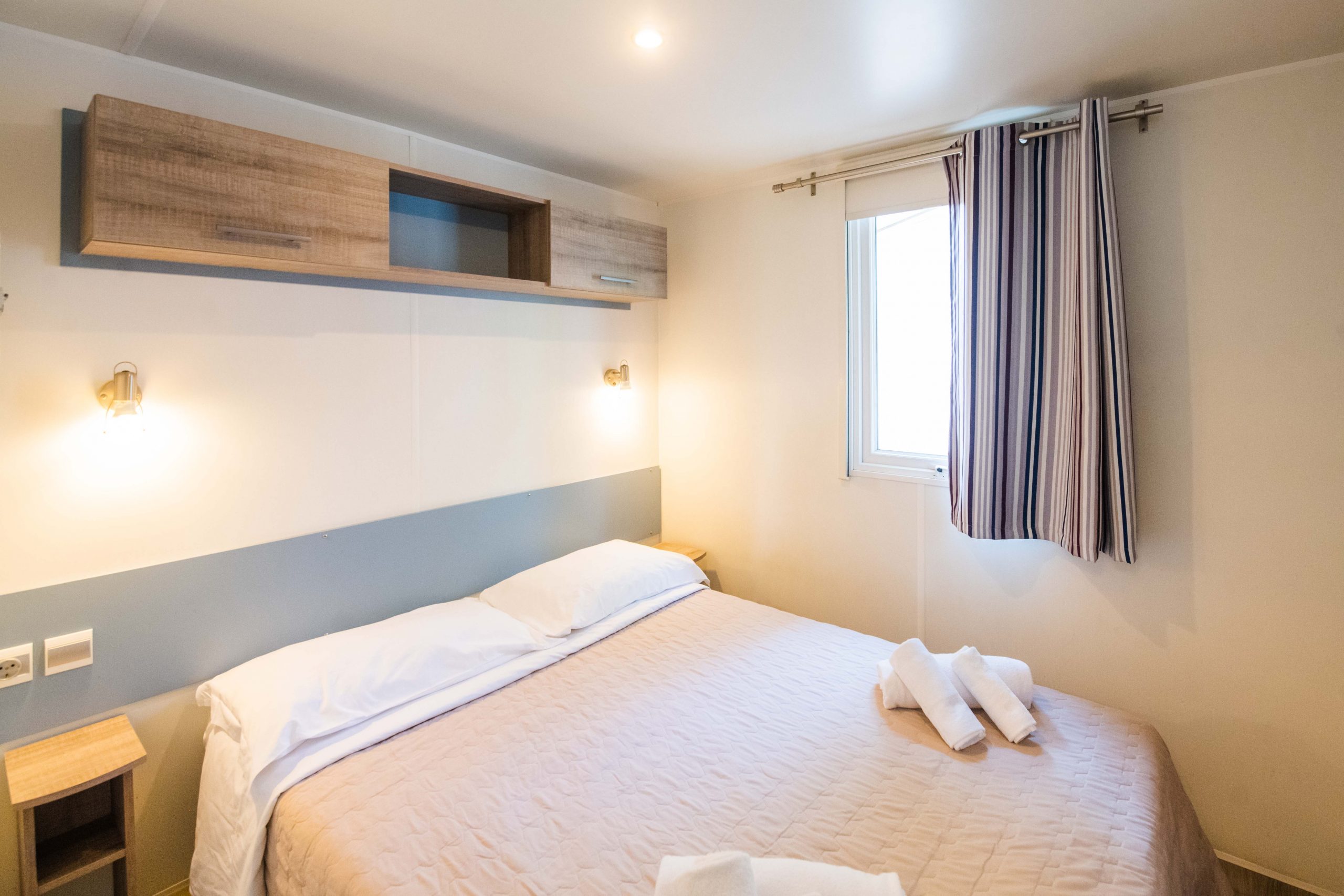Trilocale di circa 28mq che può ospitare in piena comodità fino a 6 persone. Composto da zona giorno con angolo cottura e divano letto doppio, camera con letto matrimoniale alla francese da 140 cm, una camera con due letti singoli, bagno con servizi (wc e lavandino) e box doccia, tv, forno a microonde ed aria condizionata (a pagamento). Veranda esterna di circa 15mq, coperta ed attrezzata con mobili da giardino.