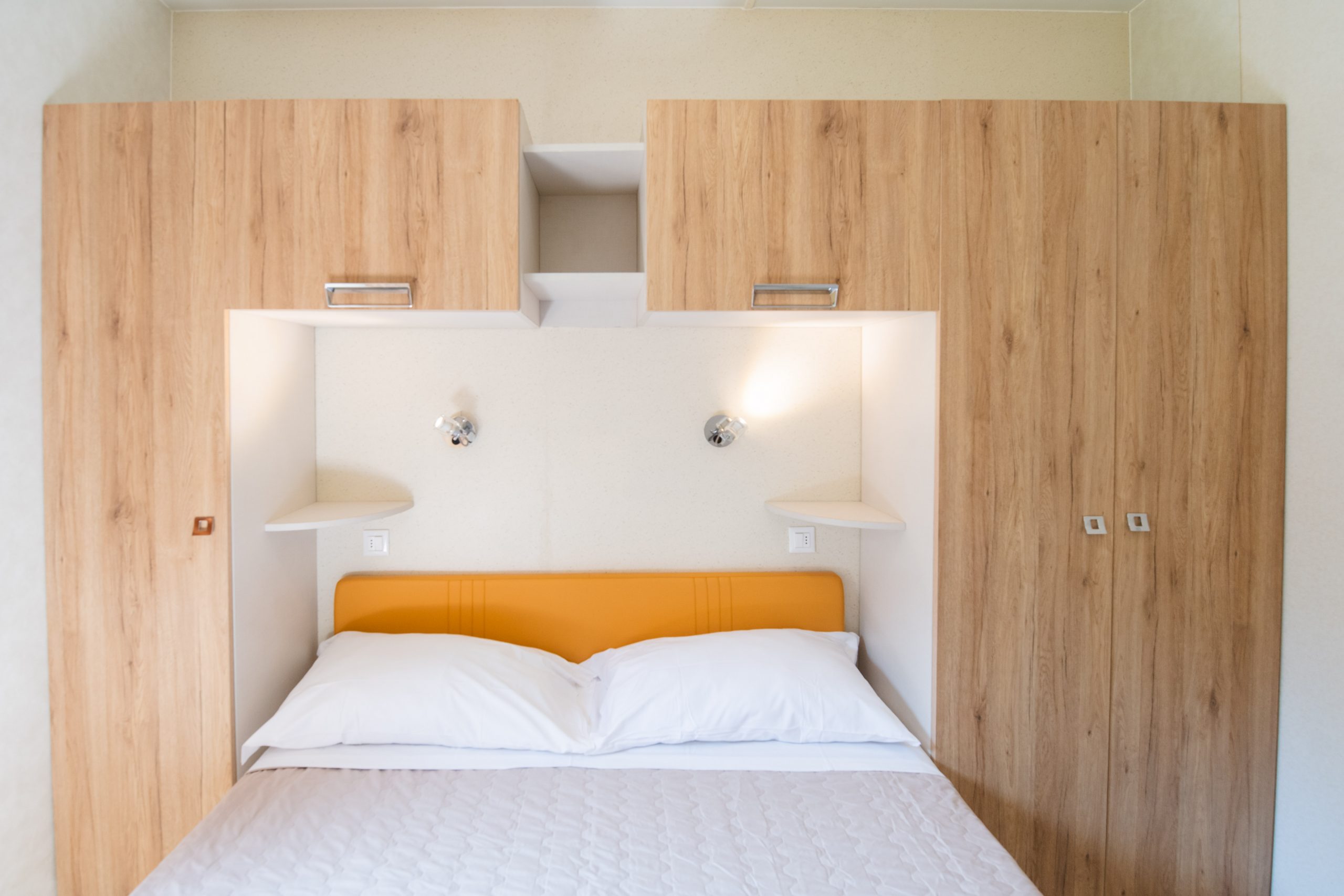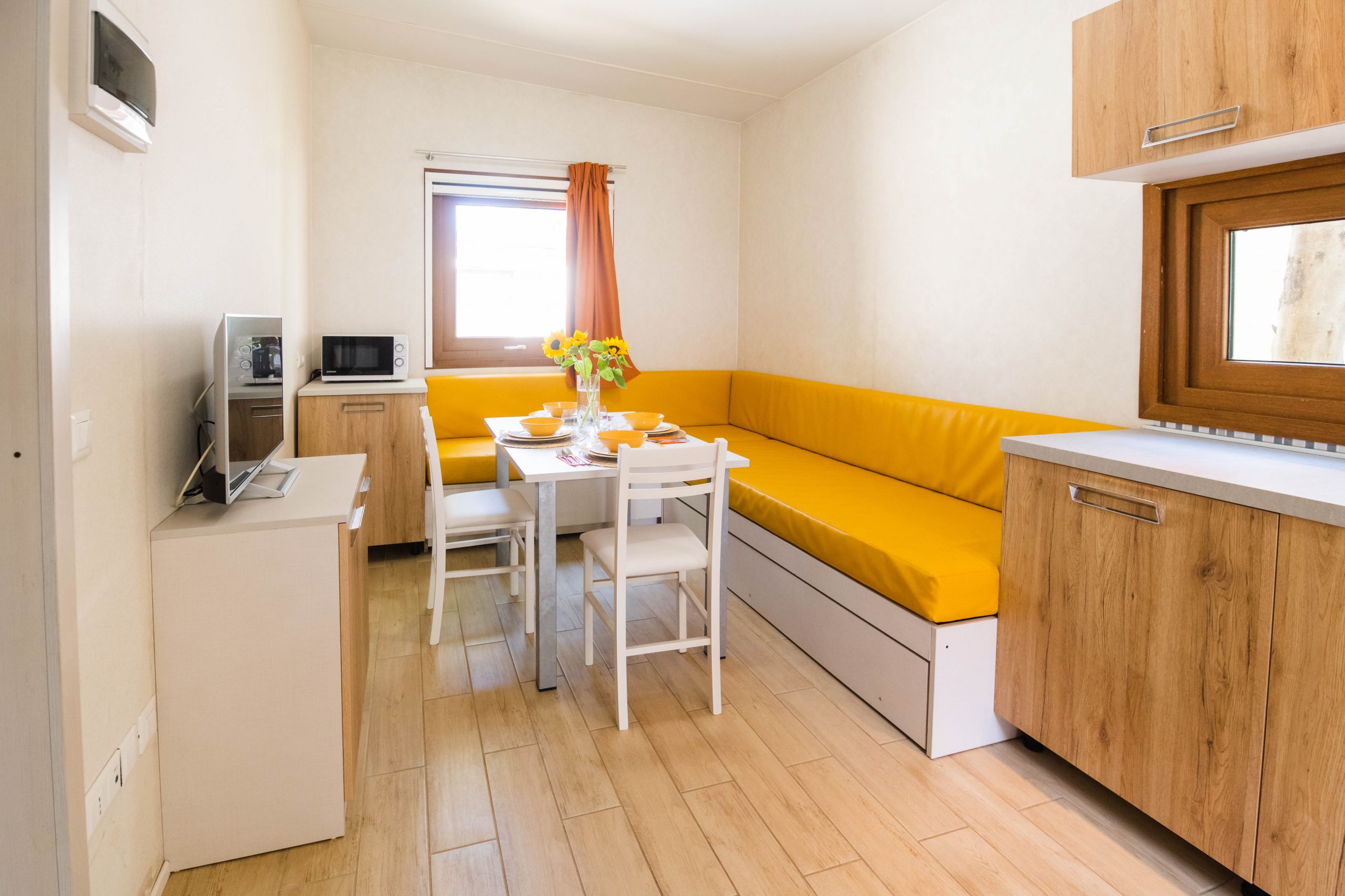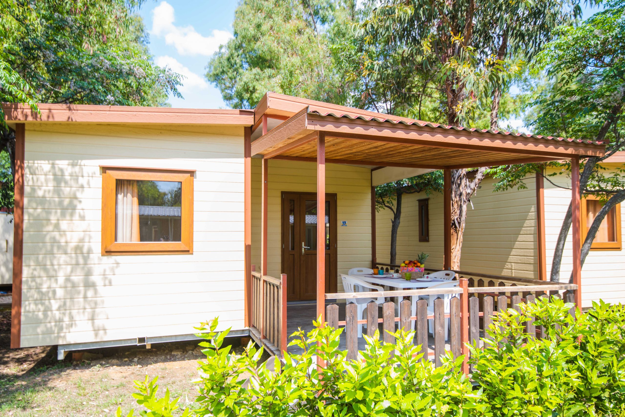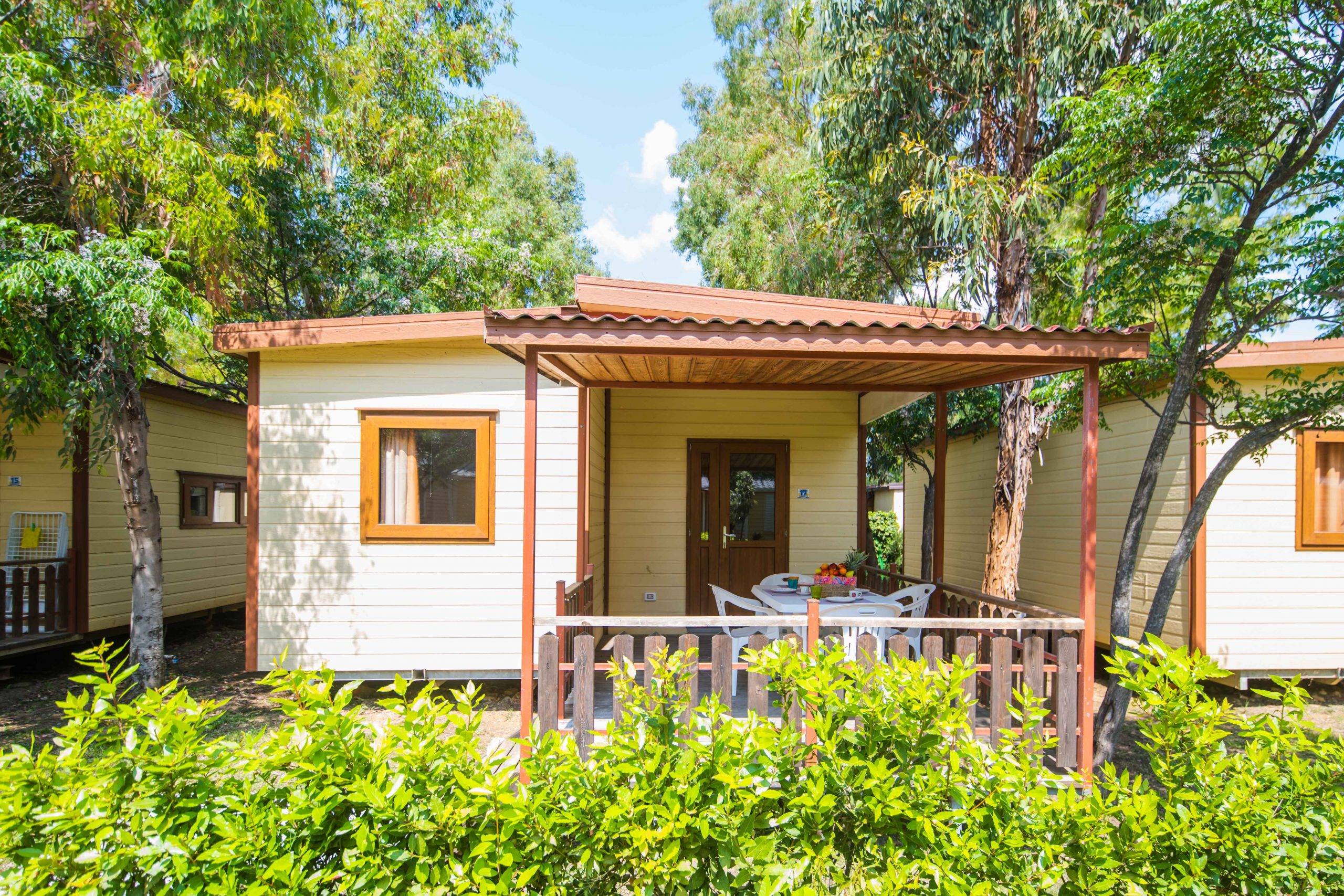 Trilocale di circa 45mq che può ospitare in piena comodità fino a 7 persone. Composto da una zona giorno con angolo cottura e divano letto doppio, una camera con letto matrimoniale, una camera con tre letti singoli (di cui uno rialzato), bagno con servizi (wc, bidet e lavandino) e box doccia, tv, forno a microonde ed aria condizionata (a pagamento). Veranda esterna di circa 12mq coperta ed attrezzata con mobili da giardino.