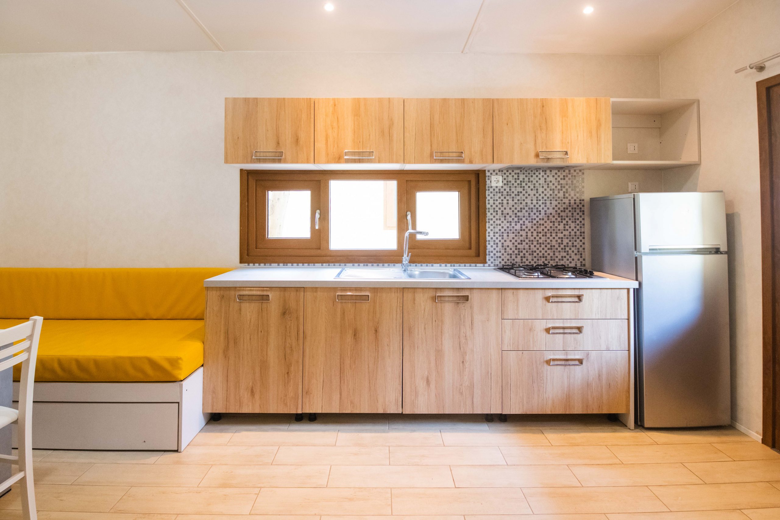 Trilocale di 28 mq per 6 persone, con angolo cottura, divano letto, camera matrimoniale, camera con letti singoli, bagno con doccia e veranda arredata. Aria condizionata a pagamento. Animali non ammessi.
